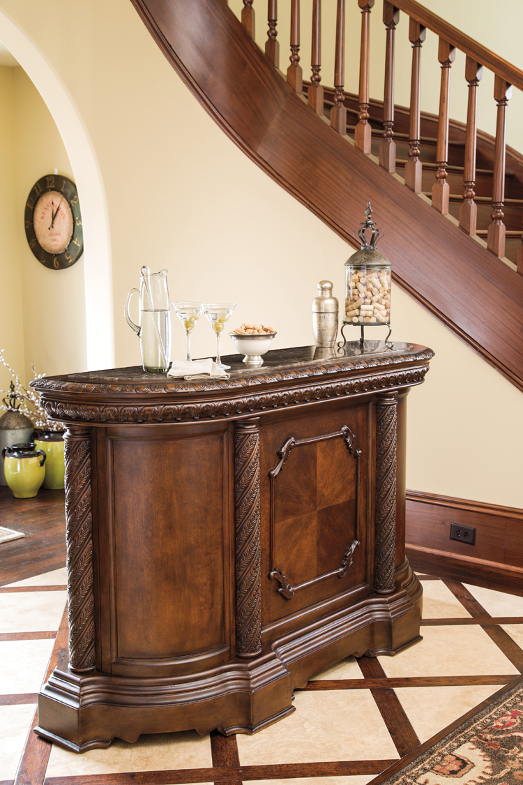 -Hardwood & Veneer Construction in a Dark Brown Finish--Bar Has Carved Edges and Luxurious Inlay Marble Top--Marble-Top Bar is 255 lbs & Measures 70"W x 21"D x 43"H--Bar Has Wine Storage, Pull-Out Tray, Adjustable Shelf, Drawers and a Door--Matching Counter-Height & Bar-Height Swivel Stools Are Available-The "Constellations" CollectionLike us on Facebook
